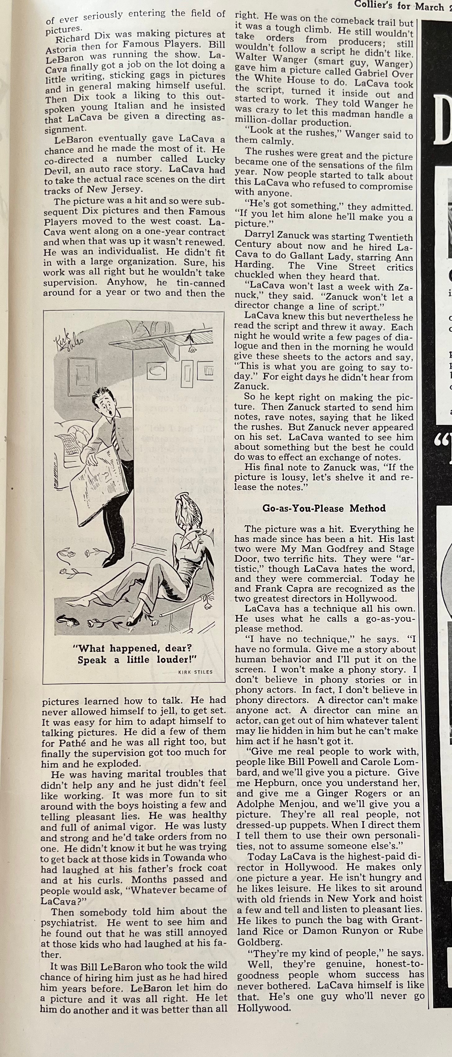 Today LaCava is the highest-paid director in Hollywood. He makes only one picture a year. He isn’t hungry and he likes leisure. He likes to sit around with old friends in New York and hoist a few and tell and listen to pleasant lies. He likes to punch the bag with Grantland Rice or Damon Runyon or Rube Goldberg.