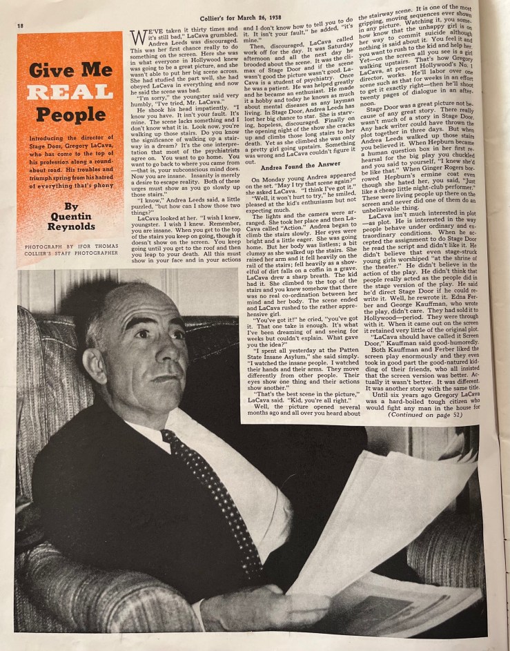 LaCava isn’t much interested in plot—as plot. He is interested in the way people behave under ordinary and extraordinary conditions. When he accepted the assignment to do Stage Door he read the script and didn’t like it. He didn’t believe that even stage-struck young girls worshiped “at the shrine of the theater.” He didn’t believe in the action of the play. He didn’t think that people really acted as the people did in the stage version of the play. He said he’d direct Stage Door if he could rewrite it. Well, he rewrote it. Edna Ferber and George Kauffman, who wrote the play, didn’t care. They had sold it to Hollywood-period. They were through with it. When it came out on the screen it retained very little of the original plot.