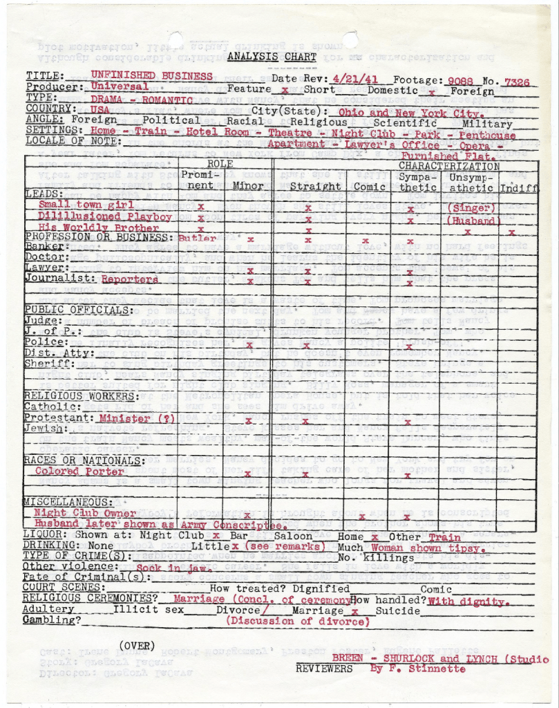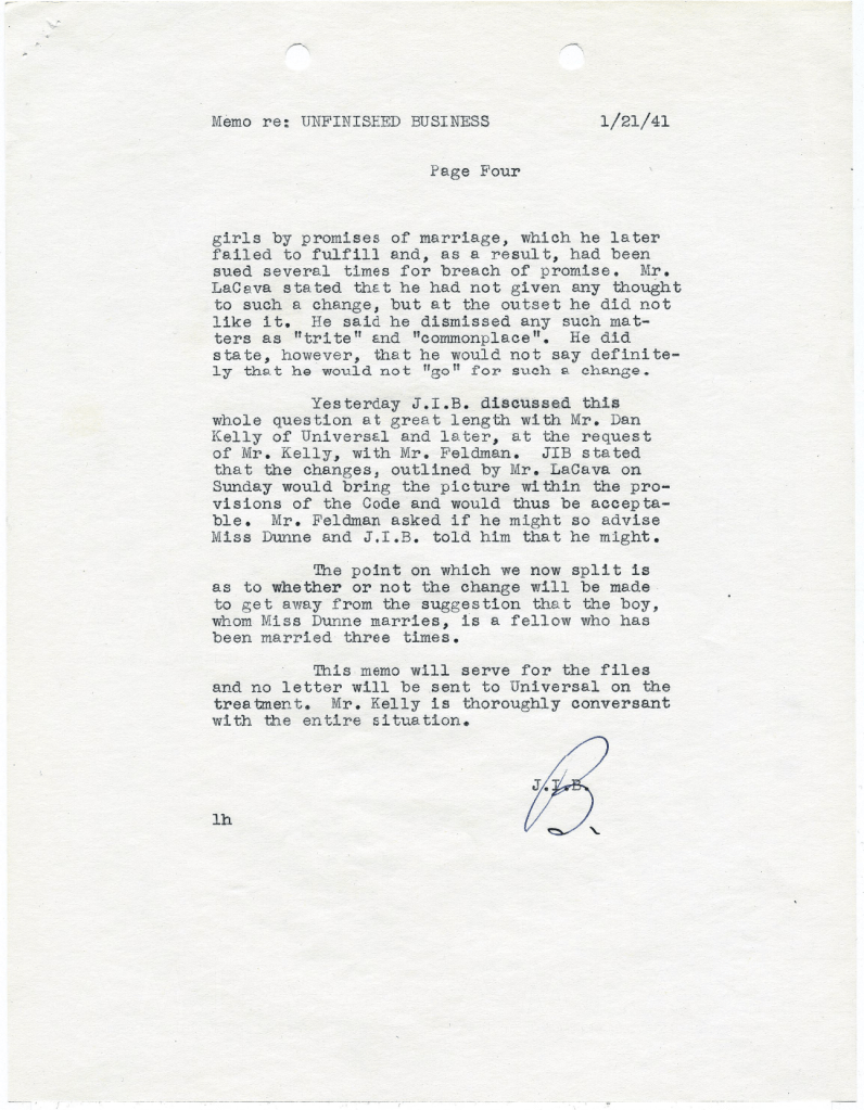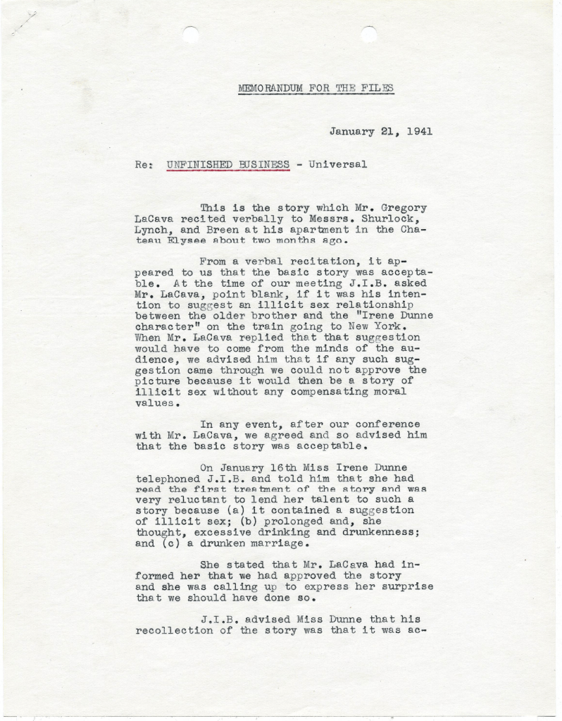 Unfinished Business itself is a more moralistic screwball than other and previous films from La Cava, meaning the rather direct and honest presentation of alcoholism as well as sexuality in the picture was of concern at the time of production due to the Production Code. I’d like to share with you an amusing anecdote regarding how one of these potentially Production Code violating details, the implication that Irene Dunne and Preston Foster had a sexual encounter on the train, remained in the picture. In a memorandum by Joseph Breen on his meeting with La Cava upon request by Dan Kelly of Universal because of his concerns about the inclusion of alcohol and sex in the film, Breen wrote that he discussed the story at length at La Cava’s home, where Breen believed that La Cava did actually agree that any indication that the older brother had had an affair with the girl who later marries his younger brother was not only highly distasteful, but also, in La Cava’s words, “suggestive of incest”. La Cava’s successful navigation of the Production Code to keep this scene in the picture is fascinating when you see the suggestive camera movements following Dunne and Foster’s kiss, and indicative of La Cava’s dedication to his story. The below attachments are the memo and analysis for the Production Code issues. Courtesy of the Margaret Herrick Library: