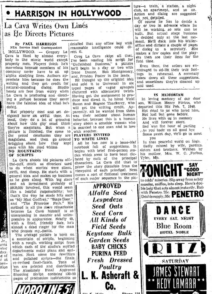 Here are some interviews and articles from around the release of Unfinished Business. You see La Cava’s off-the-cuff method of improvisation is focused on in a particular detail by this point of La Cava’s career: